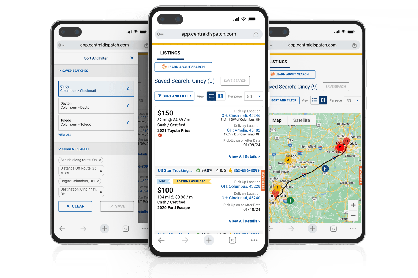 Never miss a new load opportunity with our mobile-friendly website for phones and tablets. Access all advanced search features including saved searches, price check, and more. And get notified the moment new listings that match your saved searches are posted.