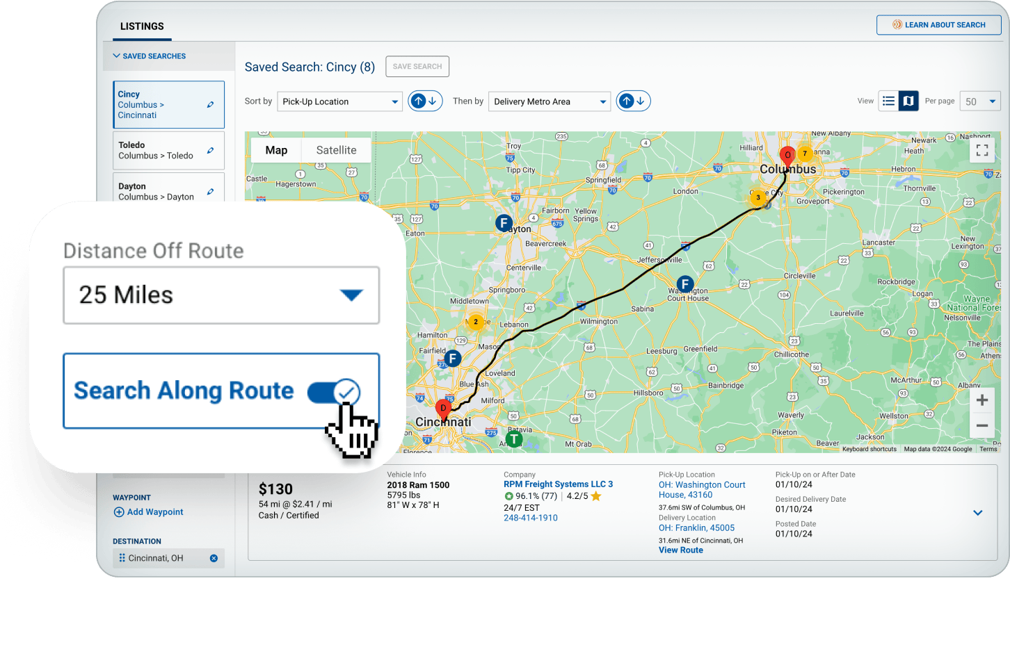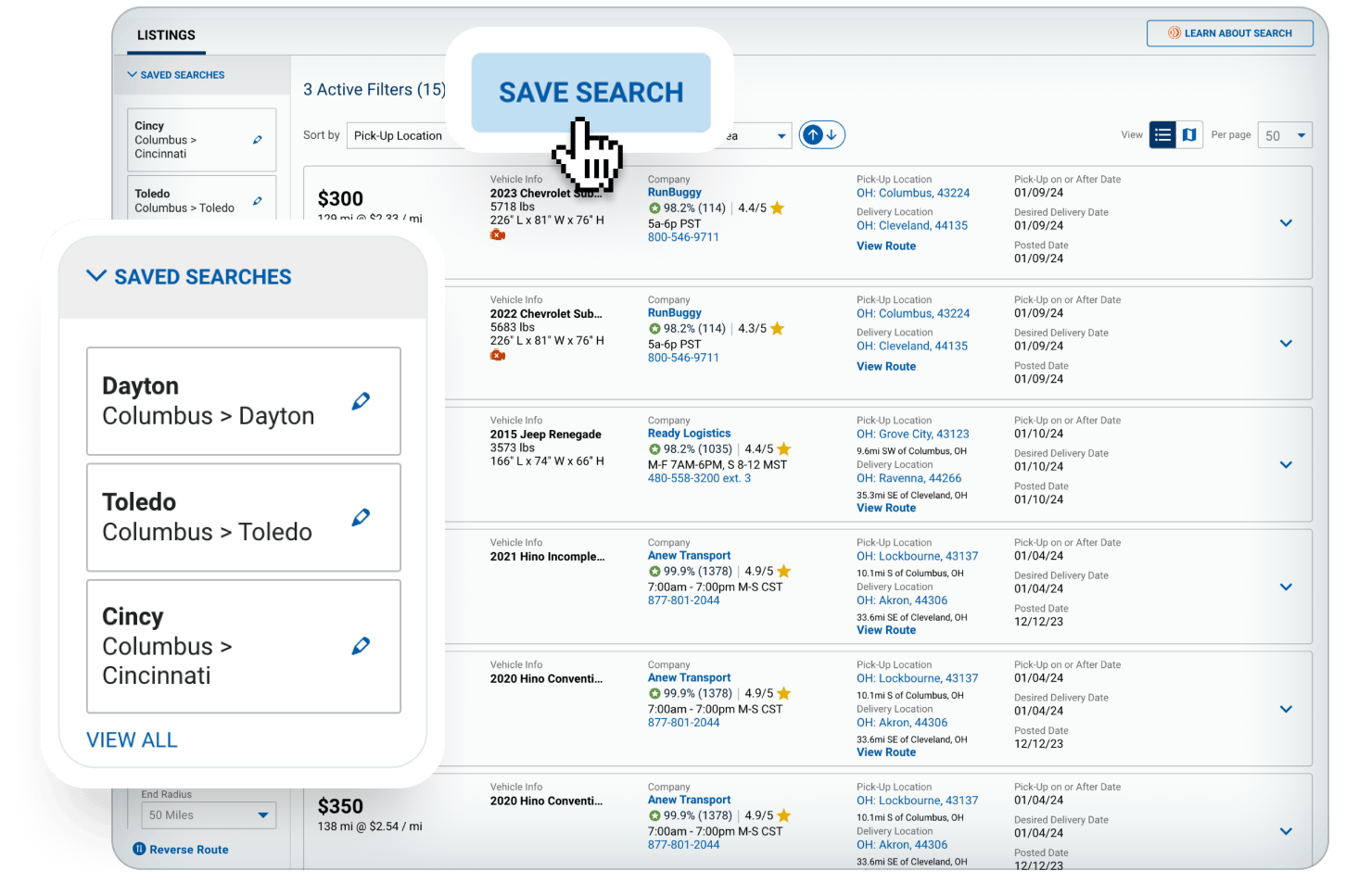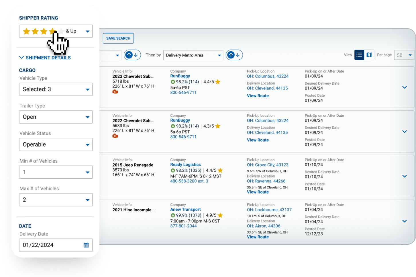 Our search makes pinpointing the perfect loads for your trucks quick and intuitiveAdvanced Search helps carriers navigate our marketplace, and quickly narrow listings down to the most profitable and efficient loads for their business. Filter by location, destination, number of vehicles, minimum payment, and much more.